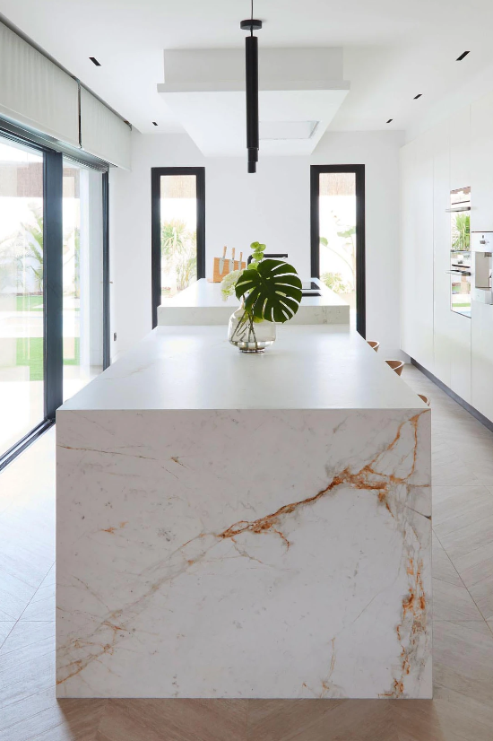 Wyspa kuchenna wykonana z białego spieku kwarcowego Neolith Abu Dhabi do wnętrz glamour i nowoczesnych